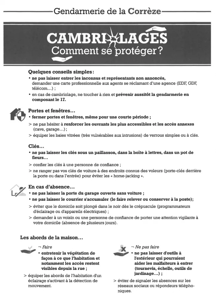 🏠 À la maison • Fermez portes et fenêtres, même pour une courte absence. • Ne laissez jamais vos clés sous un paillasson, dans un pot de fleurs ou dans la boîte aux lettres. • Ne laissez pas d’outils dehors (échelle, tournevis, matériel de jardin) qui pourraient aider à entrer.
