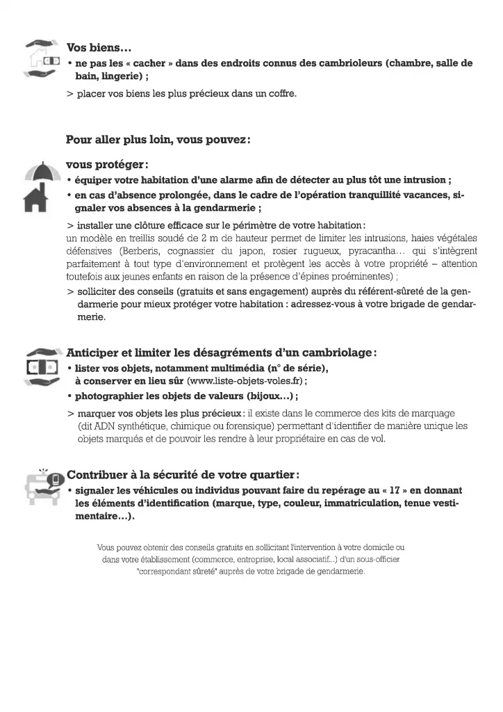 📞 En cas de doute ou de cambriolage • Ne touchez à rien et appelez immédiatement le 17. • Signalez tout comportement suspect (véhicule, repérage…).