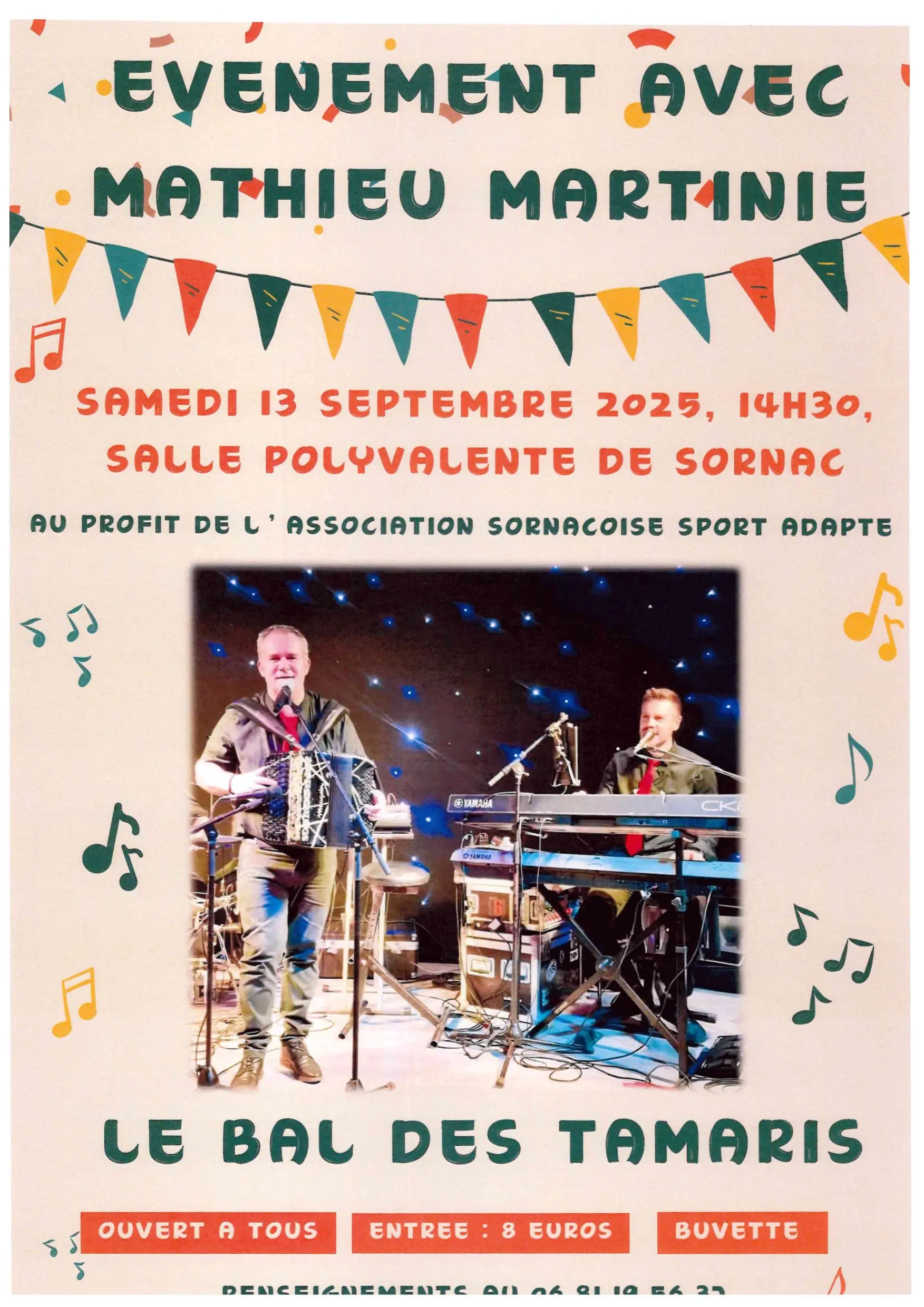 Événement festif à Sornac ! Les Tamaris vous donnent rendez-vous le samedi 13 septembre 2025 à 14h30, à la salle polyvalente de Sornac, pour un grand bal animé par Mathieu MARTINIE. Entrée : 8 € Une buvette sera disponible sur place. L’intégralité des fonds récoltés sera reversée à l’Association Sornacoise Sport Adapté des Tamaris. Venez […]