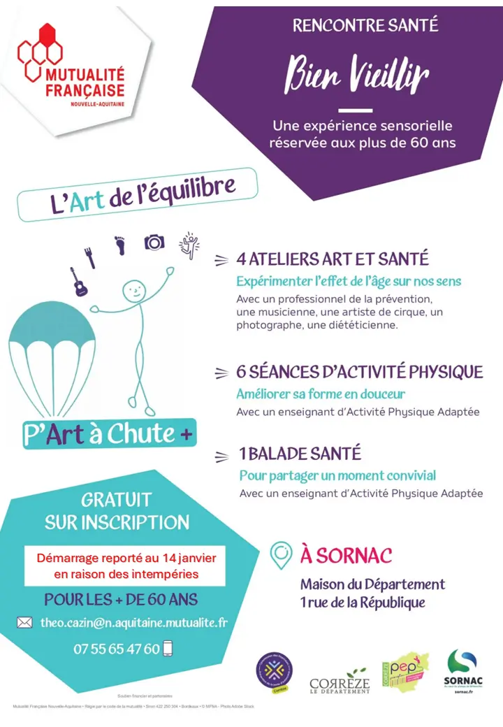 En raison des intempéries, la session du 07 janvier 2026 est reportée. Pour entretenir la forme des seniors et limiter le risque de chutes, la Mutualité Française Nouvelle-Aquitaine et ses partenaires proposent aux seniors un cycle de 11 rencontres santé dans la commune de Sornac. Elles se tiendront entre janvier et mai 2026. La […]