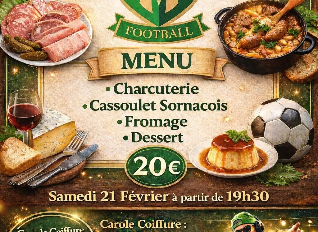 le traditionnel repas du foot Repas, buvette, animations et tombola géante, uniquement sur réservation. Repas enfant moins de 12 ans = 12€
